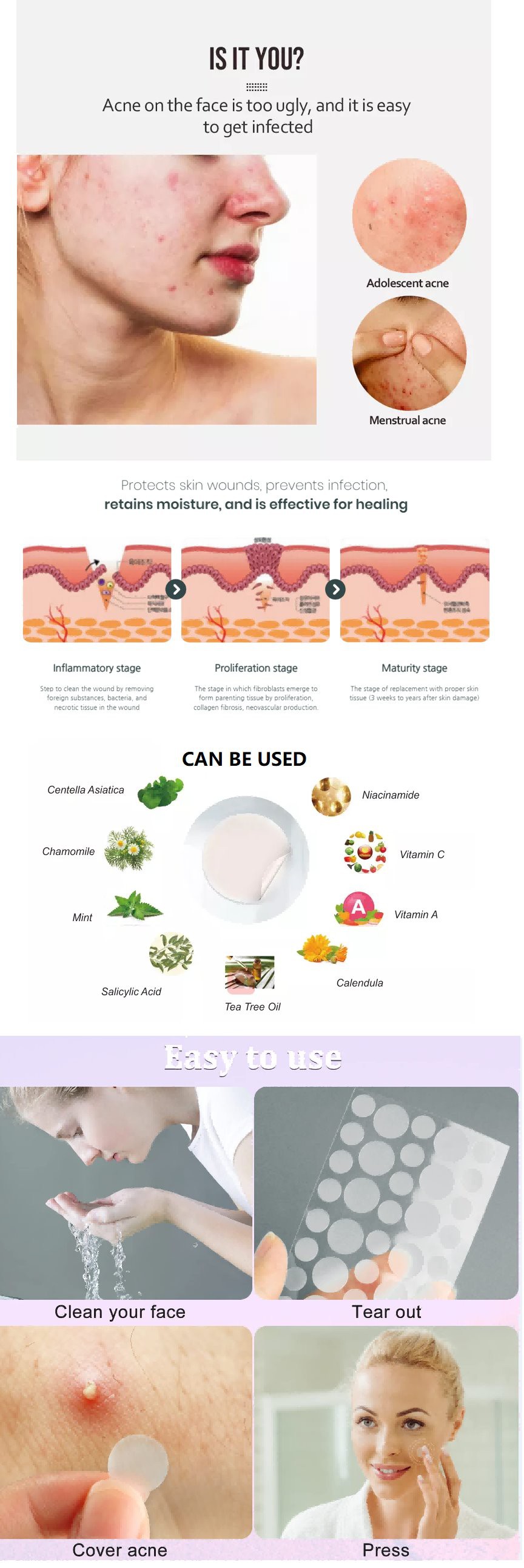 Pimple Master Patch е специален хидрофилен хидроколоид като основна суровина, тази паста за суровини върху акне може да абсорбира секрети, да помогне за изглаждане на акне. И може да намали вероятността от бактериална инфекция, по-подходящ за възпалено акне.